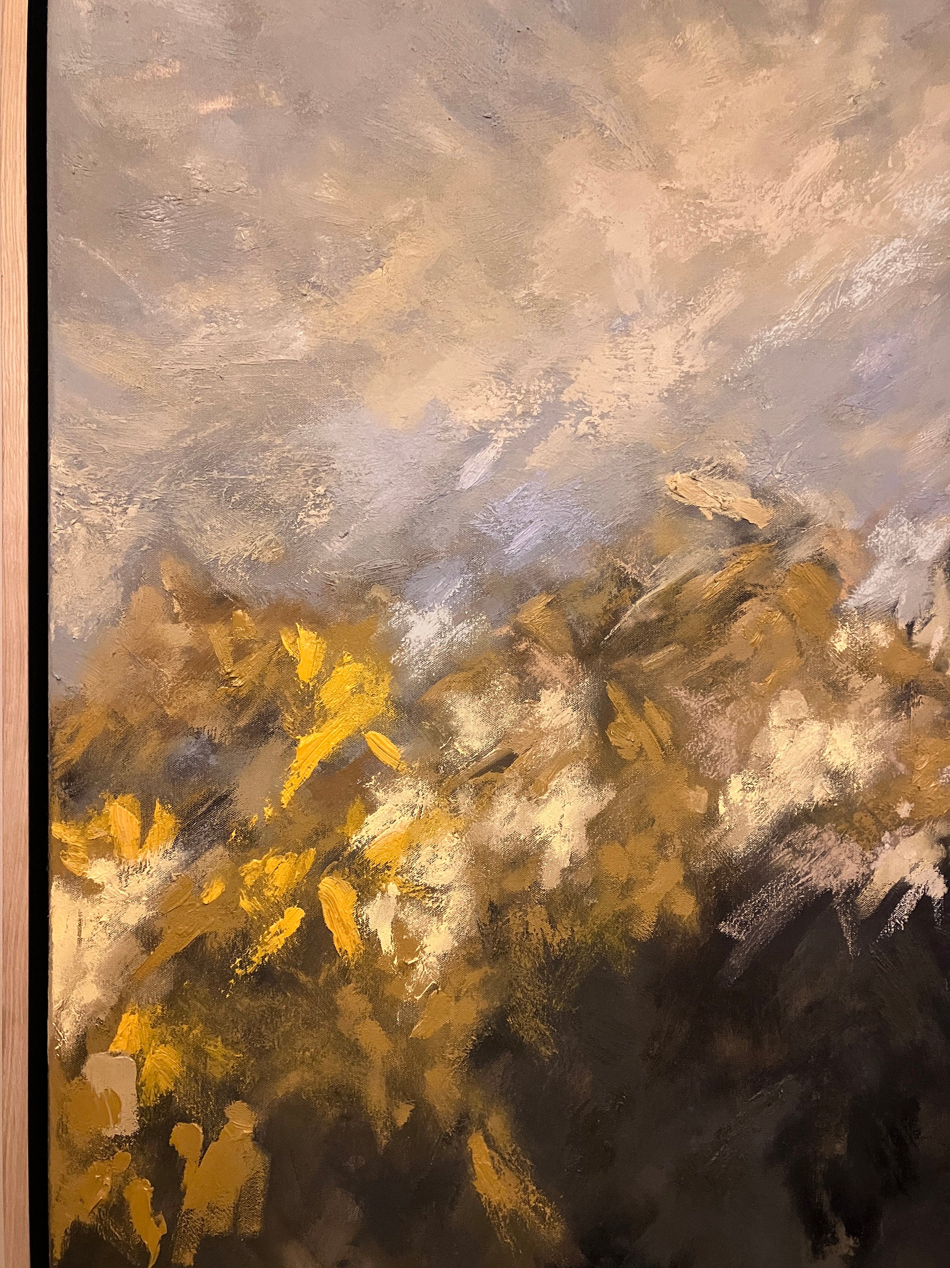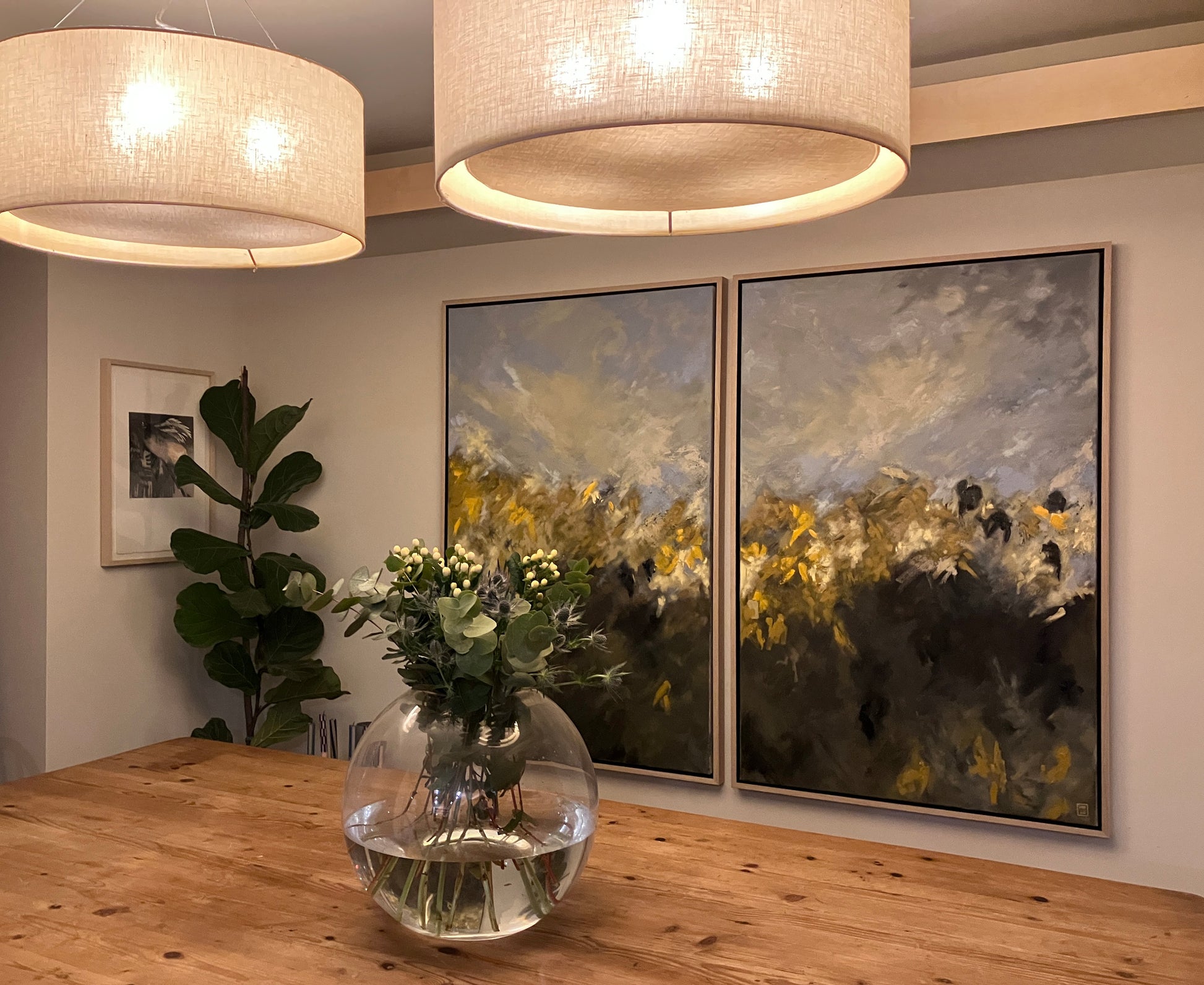 Each painting is framed with an oak and black tray frame and measures 952 mm (w) x 1452mm (h). I suggest a 50mm gap is maintained between the paintings so the overall measurement for the diptych would be 1954mm (w) x 1452mm (h)